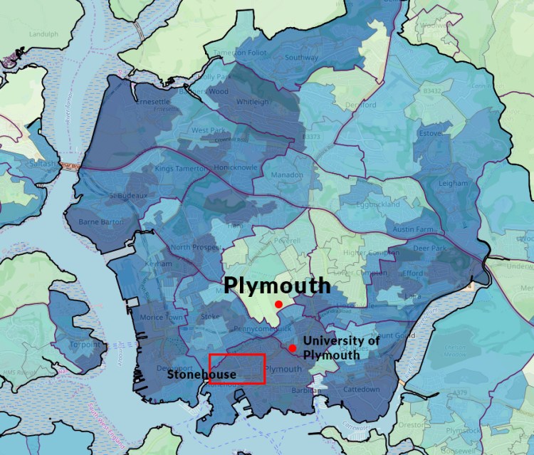 Stonehouse is a neighbourhood that vies with Devonport for the unenviable title of Plymouth’s most deprived location falling within the most deprived 1% nationally (LSOA E01015155- ranked 163rd overall in UK in IMD 2019, and 34th for Health Deprivation and Disability Score). 43% of families in the area are on a low income and depend on benefits, and nearly a quarter of adults are depressed or mentally ill, with over 14% suffer from violence in their family. Geographically, Stonehouse is located in the very centre of the city, and is a 10 minute walk from the University of Plymouth. Yet, currently there is little engagement between the University population and Stonehouse community.